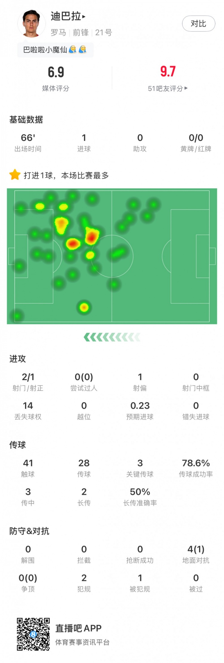 Dybala đá chính cho Roma trong 66 phút, ghi 1 bàn và thực hiện 3 đường chuyền quan trọng.