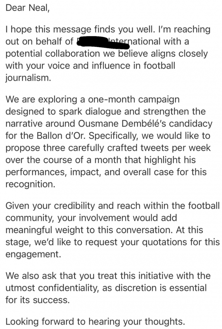 Blogger Neal (với 168.000 người theo dõi) cho biết một công ty quan hệ công chúng đã liên lạc với anh ta với hy vọng rằng anh ta sẽ xây dựng động lực cho cuộc thi của Dembele cho Quả cầu vàng.